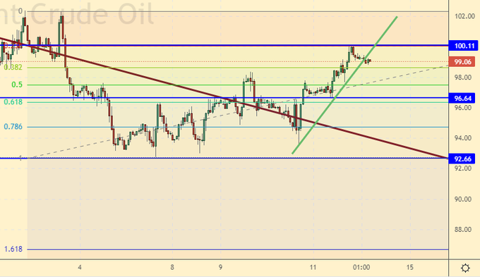 Как и предполагалось вчера, быки пощупали на прочность уровень 100.00. Пока пройти выше не получилось, и скорее всего не получится. Пока мы смотрим по рынку вниз.