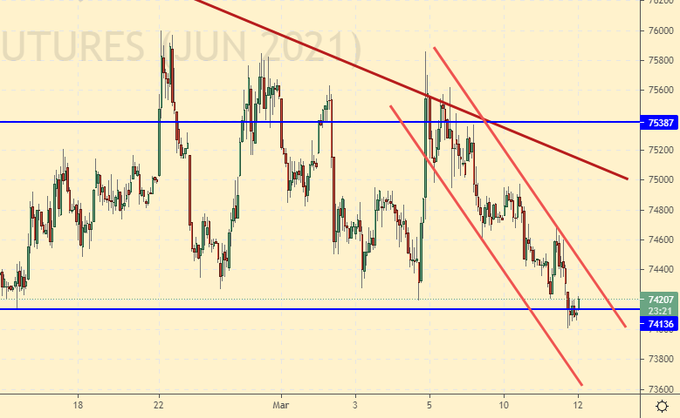 Нефть пытается пробиться к 72.00, а возможно и к 76.00, но пока мы не можем утверждать, что движение наверх продолжится. А вот уровни для тактической продажи привлекательны. В Европе продолжается бардак. Норвегия, Италия и Дания отказались использовать вакцину AstraZeneca, что еще дальше отодвигает сроки полноценной вакцинации континента. Кроме вируса палки в колеса растущей нефти может поставить и сам доллар, укрепление которого лишь вопрос времени. Вчерашние данные по рынку труда снова вышли лучше предыдущих. Экономика США начинает восстанавливаться. Одобренный пакет помощи в 1.9 трлн. долларов, как ожидается даст необходимый эффект для продолжения развития.