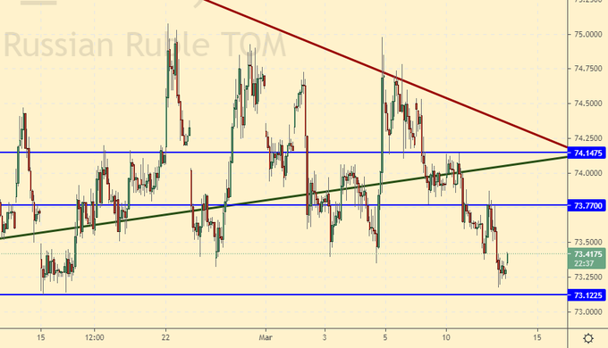 Базовый актив не показал новый минимум, а фьючерс сделал это. В такой ситуации лучше ориентироваться именно на базовый актив. Ситуация тонкая. Если нефть продолжит набирать обороты, то мы уйдем к 70.00. Продавать здесь смысла никакого нет. Для покупок ждем роста выше 74.50.