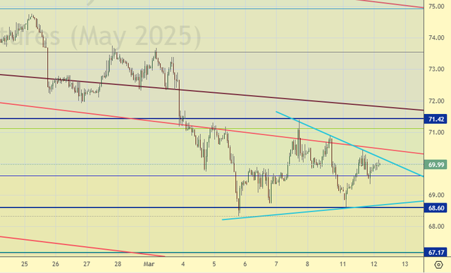 Рынок в консолидации в районе 70.00. Дальнейшее падение возможно. При этом сохраняются сомнения в долгосрочном урегулировании конфликта на Украине. Для рынка нефти это постоянное напряжение. Инфраструктура нефтяного сектора может подвергаться внезапным атакам и вызывать сбои в поставках. Товарищ Т. хочет перекроить мир, и он перекраивается, однако всегда есть шанс, что что-то может пойти не так, например, начнет разваливаться собственная экономика. А если экономика США пойдет вниз, то цены на нефть поселятся надолго в районе 40.00 (30.00), есть конфликт на Украине или его нет.