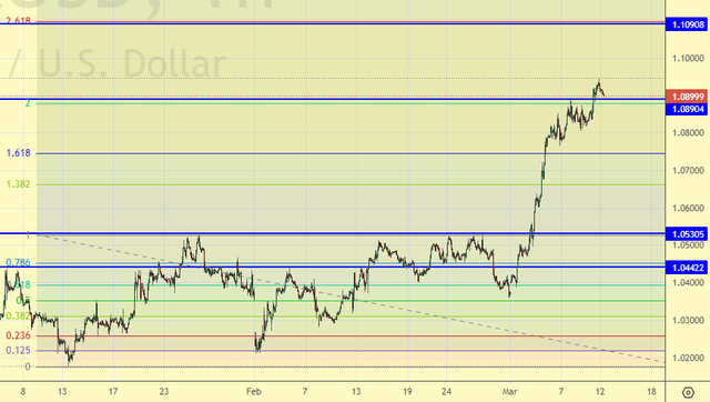 Это было подло: взяли и без отката прошли выше 1.0900. Открылась отметка 1.1090. Будем продавать оттуда. С текущих уровней можно купить. Дальнейшее падение доллара может усугубиться если мы не увидим стремления бороться с инфляцией. Если 19-го числа Пауэлл ставку не поднимет, выйдет и скажет: «Мы внимательно следим за ситуацией» при инфляции в 3.1%, то тогда и 1.2000 получим быстро.