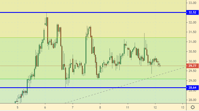 Взятие 114000 приведет к ходу на 116000 с дальнейшими перспективами роста к 125000. Пока этого не произошло, преимущество у медведей. Если сегодня рынок нефти продолжит уходить вниз от уровня 30.00, мы можем увидеть и падение рубля, и ослабление индекса.