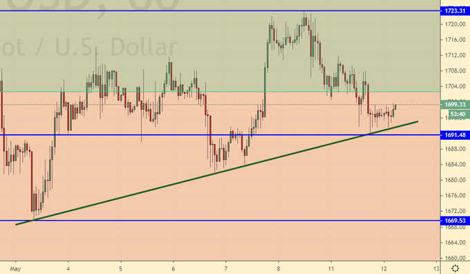 В понедельник на ММВБ не было торгов, в остальном же мире золото продолжало котироваться. Видим попытку закрепиться ниже 1700. Если котировки на текущих уровнях простоят весь сегодняшний день, то у нас есть большие шансы на то, что уровень 1700 не выдержит и рынок отправится вниз.