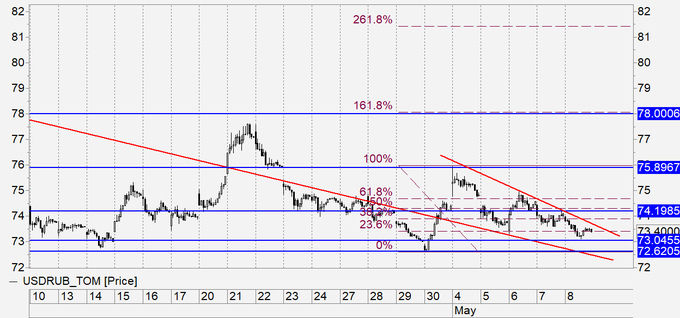 Судя по тому, как вчера торговался рубль на зарубежных площадках, а никаких эксцессов не произошло, сегодня мы откроемся на уровнях пятницы. Если учитывать, что уже на следующем заседании Банка России ключевая ставка может быть снижена до 4,5% годовых у быков по паре появляются шансы. Если котировки до конца недели продержатся выше 73.00, то это создаст фундамент для движения вверх. В противном случае, поклонники национальной валюты смогут развить успех до отметки 70.00.