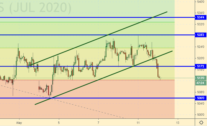Так как урожай кукурузы прогнозируется высокий, ценам сегодня будет непросто продемонстрировать рост. И тем ценнее будет тот факт, если этот рост состоится. Если исходить из поговорки: «Продавай на слухах, покупай на новостях», сегодня нас должен ждать именно ход вверх, так как ожидание хорошего урожая уже в цене. USDA должен спрогнозировать для кукурузы что-то уж слишком неприличное, например, 1550 млн. тонн валового сбора, для того чтобы цены отправились в район 250.0 центов за бушель, да там и остались до конца сезона 2020/2021.