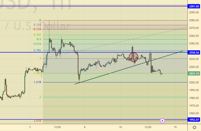 Крепкий доллар продолжает поддавливать котировки золота, которые рискуют в нарисованной картинке резко пойти вниз. Не будет ничего удивительного если мы достигнем 1950 через пару дней.