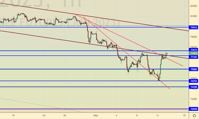 Продажа: нет. Кто в позиции от 77.00, перенесите стоп на 77.10. Цель: 66.67.