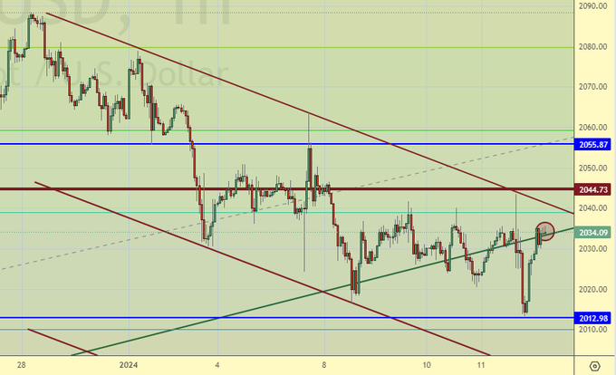 Инфляция в США оказалась выше предположений аналитиков, что должно привести к укреплению позиций доллара. Через неделю ожидания снижения ставок в США снова овладеют рынком, но пока у доллар есть шанс. Мы не можем пройти выше 2050, а раз так, то будем смотреть вниз.