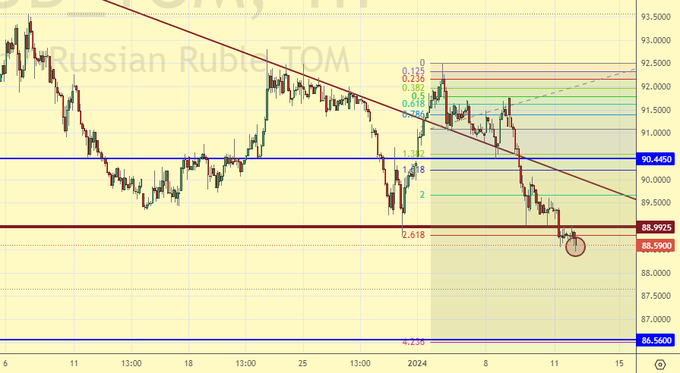 Ушли ниже 89.00, вынуждены войти в шорт по паре. Цель внизу обозначим: 80.00, более точно можно будет сказать по ходу развития событий. Появилась информация, что ЦБ будет продавать на рынке валюты больше, чем ожидалось.