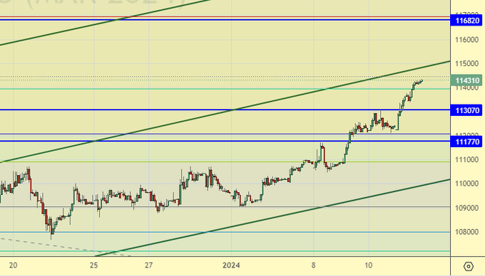 Ушли мы выше 113100. Покупки с текущих уровней выглядят запоздалыми. Если будет откат к 112000 можно будет войти в лонг. В противном случае ищем возможности на других рынках. Дивидендные истории поддерживают российский фондовый рынок.