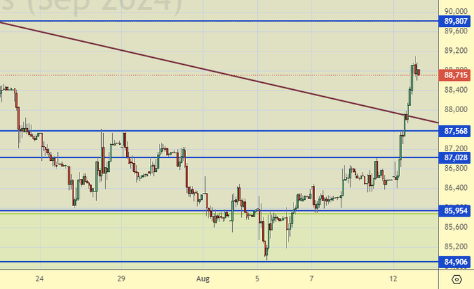 Покупка: нет. Кто в позиции от 85795, перенесите стоп на 86400. Цель: 100000.