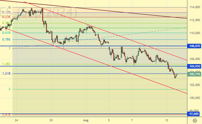 Ушли ниже 103700, что должно нас привести к 101000, затем к 97600. Вряд ли имеет смысл в принципе лезть в российские акции. Рассказы о том, что многие частные лица купили много бумаг в июне и июле отнесем к сказкам, а пиит сказки сказочники. А вот в приток денег на вклады верим. Почему бы нет.