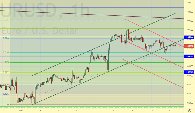 Неплохая, но и не самая радужная ситуация для быков. Мы вышли из растущего канала, что может привести к падению на 1.0870. Завтра выйдет очередной блок статистки по США, который может привести к новым сильным движениям на рынке. Напомним, что уже 20-го числа заседание ФРС.
