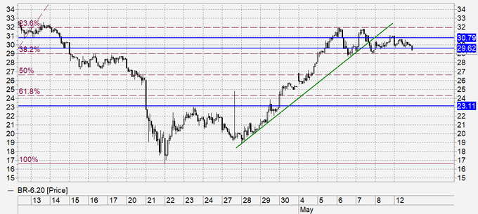 Продажа: нет. Кто в позиции от 31.00, перенесите стоп на 31.10. Цель: 25.10 (10.00?).