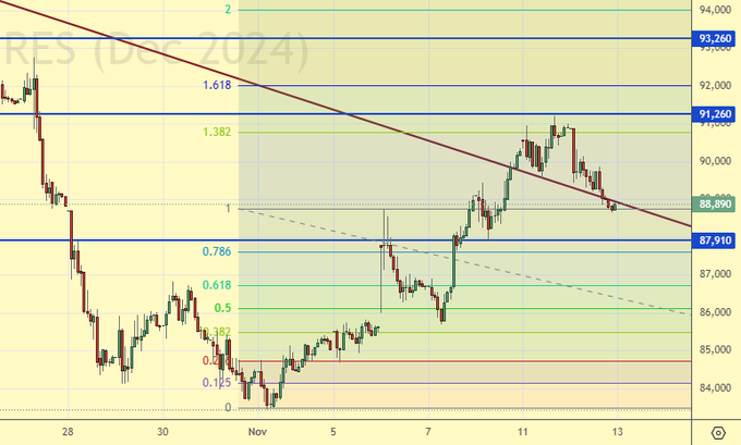 Если мы в будущем идем вверх, то текущие уровни это то место, где надо проявить настойчивость при покупках. Несколько смущает то, что мы не смоги сразу достигнуть 92000 и остановились на 1.382 по Фибо от первого импульса. А вниз? А вниз надо уж стоять со вчерашнего дня.