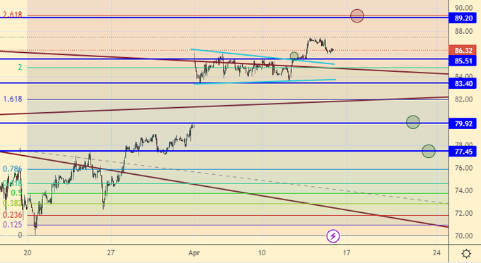 Покупка: нет. Кто в позиции от 85.70, перенесите стоп на 85.30. Цель: 89.20.