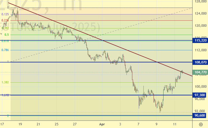 Дикая волатильность. Исходя из возможности дальнейшего укрепления рубля можно предположить, что мы сможем откатить вверх к 114000. Если ориентироваться на развитие импульса вниз, то нас ждет 80000, вопрос лишь в том как мы придем к этой отметке.