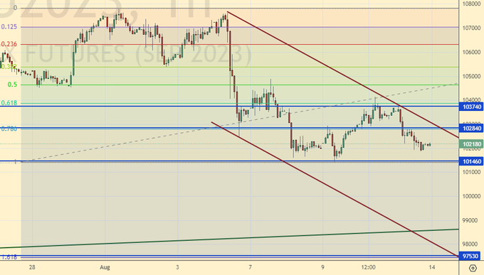 Мы растем, причем пока безостановочно. Скорее всего мы достигнем в ближайшие дни уровня 102.50, после чего будет небольшой откат. Отметим, что технически рынок смотрит на 114.00. Пока не слышно о том, чтобы экспортеров каким-либо образом обязали бы возвращать валюту в страну. Видимо, опустить валютный курс проще.