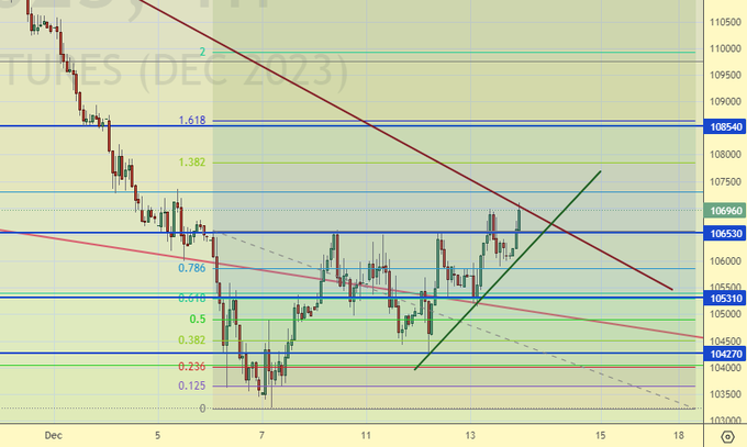 Видим стремление пробиться выше 107000. Пока имеет смысл держать лонг. В районах 108500 и 110000 возможны распродажи. Российские бумаги могут сегодня показать восстановление на фоне выступления президента, но оно будет скоротечным. Завтра Набиуллина поднимет ставку и это приведет к новому раунду распродаж на рынке акций.