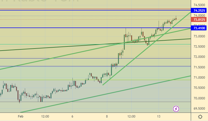 Район 74.00 – 74.25 является зоной сопротивления с точки зрения техники. Если его не удастся пройти сразу, то можно будет рассуждать об откате в район 70.00, в противном случае нас будет ждать быстрое восхождение к 82.00, затем к 88.00.