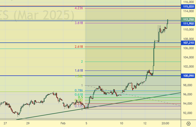 Исходя из нарисованного: мы идем на 115000. По достижению данного уровня последует коррекция, которая вернет нас к 110000. Большего сказать нельзя. Отметим, что быки очень сильно заложились в рост. И если мы не увидим существенных изменений относительно СВО, то весь этот пар уйдет в свисток.