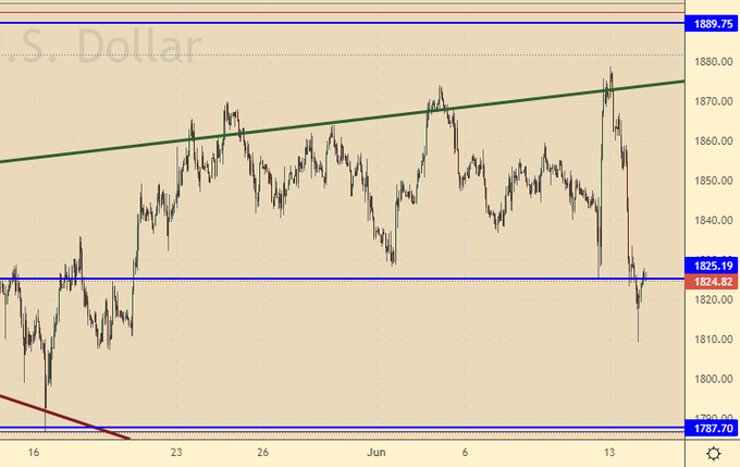 На фоне укрепления индекса доллара золото падает. Это ожидаемое движение, которое должно закончиться на 1730. Далее может последовать отскок вверх, после чего мы пойдем еще ниже на 1630 при условии, что ФРС сохранит жесткую политику. Заседание ФРС 15-го числа.