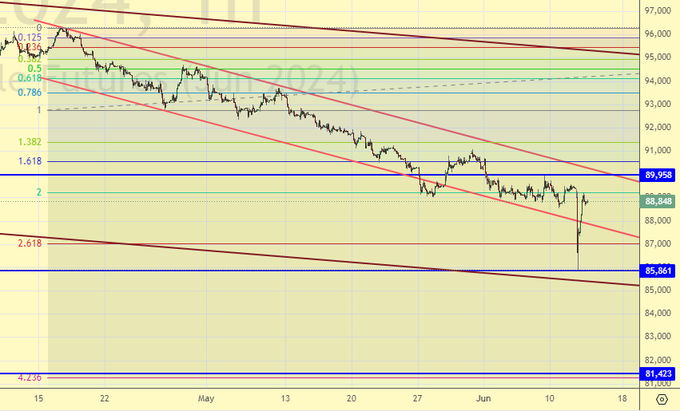 Ждем будет ли в каком-либо виде устроена реанимацию спотового рынка. Нужна ли она в текущих условиях? А пока у нас остался фьючерс. По нему и будем работать. Видим резкое падение и резкий рост. Если пройдем выше 90000 получим «шип», который должен привести нас на 95000.