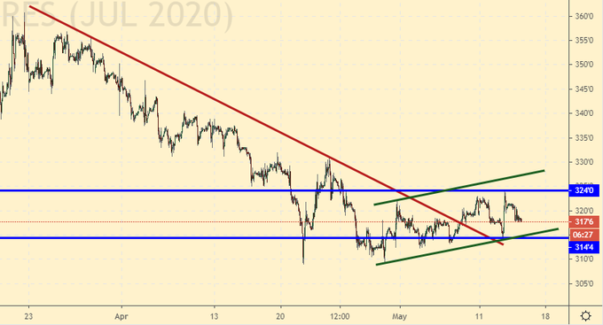 Пока стоим над уровнем 300.0 центов за бушель, но оптимизма нет. Если сегодня упадем ниже 314.0, то цены оставят пологий ценовой канал и отправятся в погружение на 250.0. Отметим, что это крайне низкие ценовые уровни, но на фоне великолепных прогнозов по валовому сбору такое поведение цен не будет выглядеть странным. Таким образом, ниже 314.0 можно продавать.