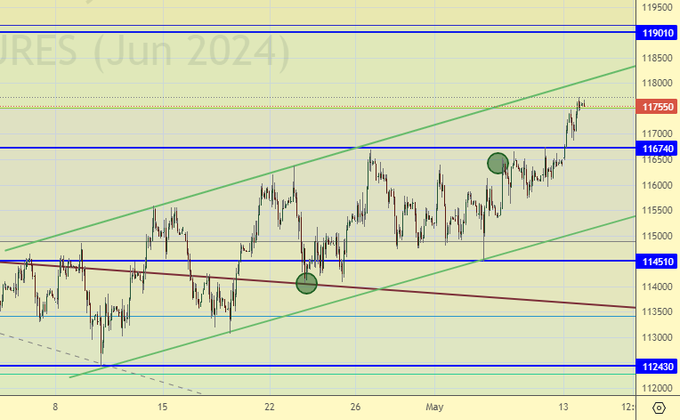 Наконец-то нас вынесло выше 117000 и отметка 119000 в зоне досягаемости. Можно рассчитывать на рост до конца мая, дальше будет продвигаться вверх тяжелее.