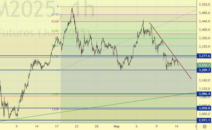 Не исключено, что сегодня будут пробовать на прочность поддержку на 3210. Если она будет взята, то увидим быстро 3100. Дальнейшее падение не очевидно, но возможно. На 3000 рынок будут встречать покупатели, закладывая снижение ставок в США, читай, победу Трампа над Пауэллом. Более разумные уровни для входа в лонг находятся на 2700.