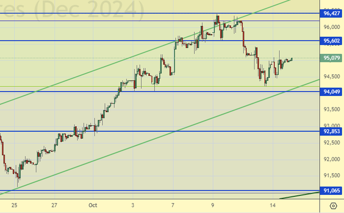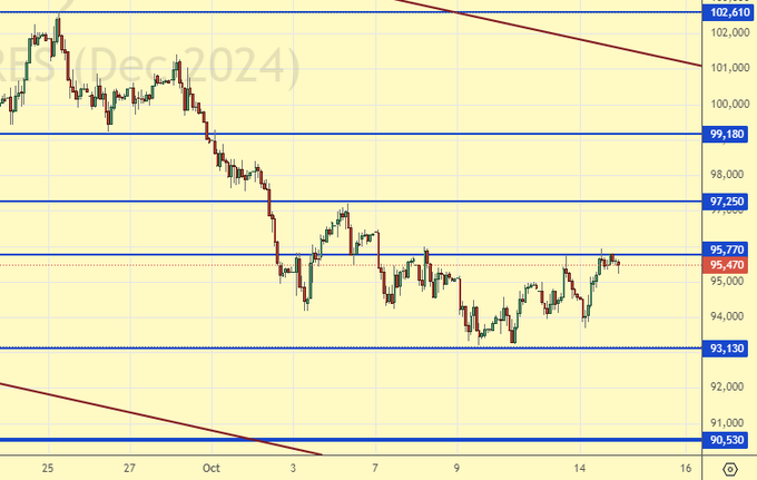 Пишем тоже, что и вчера: «можем продолжить снижаться к 92850». Не будет ничего удивительного в том, что мы продолжим лезть наверх, так как проблемы с расчетами между Россией и покупателями её ресурсов будут сохраняться, но откату к 92850 будем рады с тактической точки зрения.