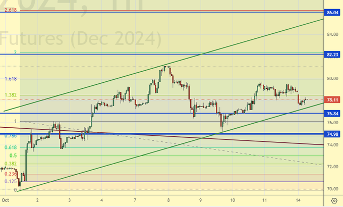 Если быки хотят продолжить наступление, то попытки залезть повыше не нужно откладывать в долгий ящик. Сегодня и завтра надо проходить вверх уровень 80.00, в противном случае возникнет угроза (отчасти она уже сейчас есть) пробоя вниз растущего канала с ростом неопределенности дальнейшего развития событий. Пока Израиль проводит наземную операцию и больших ударов нет, трейдеры не будут активно тащить рынок вверх, поэтому придется высасывать причины для роста нефти из текущих новостей. Пока все неплохо для быков, но красный дракон в любой момент может лечь на спину и поднять вверх лапки, вот тогда будет не только 70.00, но и 50.00.