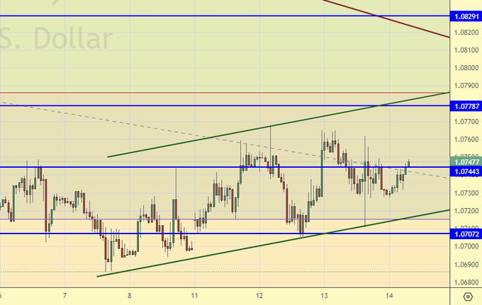 Сегодня заседание ЕЦБ, которое может повлиять на расклад сил в паре. Если ставка будет повышена, то нас ждет рост, хотя он и будет ограничен, так как в следующую среду у нас заседание ФРС. Если и в США става поднимется, причем на ту же величину, то это все равно даст преимущество доллару, фундаментальны данные по которому в паре имеют больший вес.