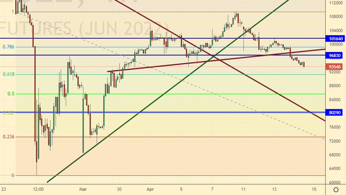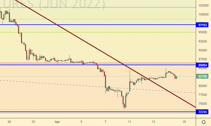 Полное расстройство на рынке акций после заявления первого лица о том, что денег нам за товары из Европы не платят. Да и что делать с этими деньгами непонятно, куда их тратить не ясно. В рамках модели «голова – плечи» можем упасть к 80000.