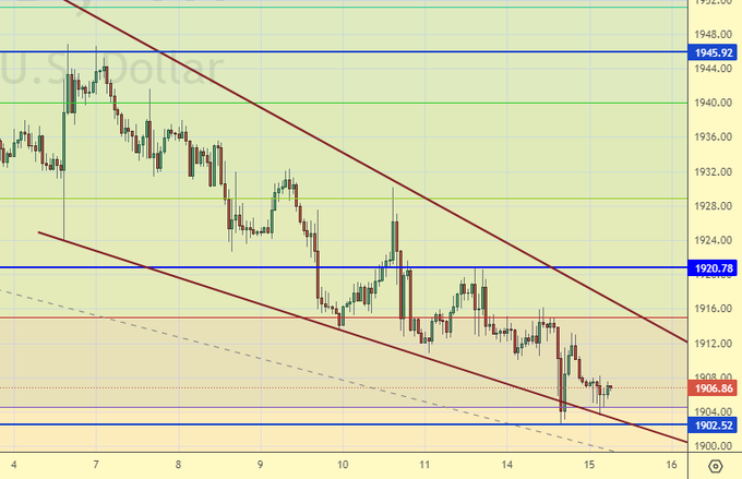 Продавцам сегодня надо пробиваться вниз (ниже 1900). Если этого не сделать, то возникнет риск разворота (пусть и кратковременного), так как уровни для покупок здесь очень привлекательные. Пока держим шорт двигаем стоп-ордер по тренду.