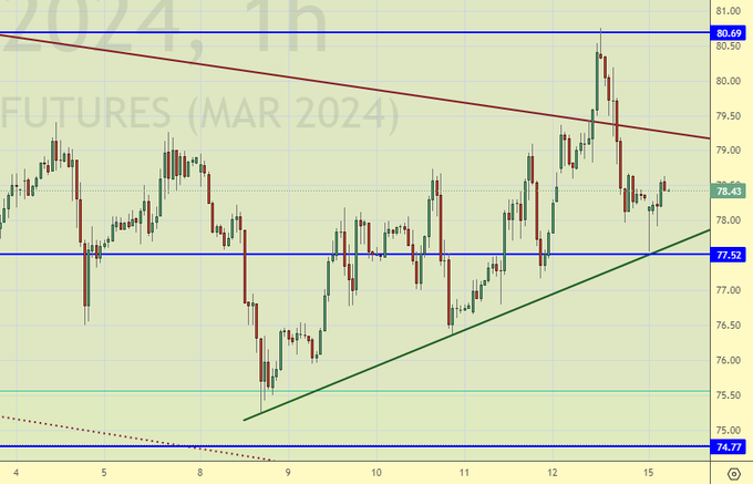 Обострение в Красном море продолжит держать рынок в тонусе. Мы бы и хотели бы упасть, но кто ж даст в такой-то непростой ситуации. Продавцы откровенно удивят если смогут на этой неделе пробиться ниже 75.00. На самом деле текущие цены всех устраивают, поэтому и сильных атак в обе стороны ожидать не стоит. Для существенного роста или падения нужно, что-то большее, чем обстрел идущих через Баб-Эль-Мандебский пролив судов.