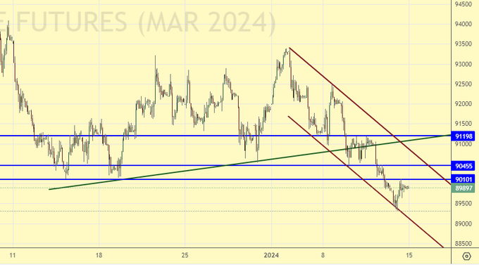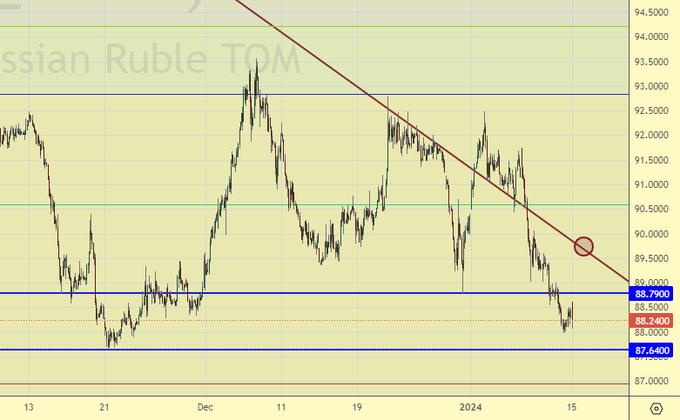 Обострение в красном море поддержит цены на нефть, что позитивно для рубля. Мы в состоянии при текущей ставке и продажах валюты в рамках бюджетного правила уйти к 85.00, возможно к 80.00. Следующие три недели, вплоть до 6-го февраля, могут стать бычьими для рубля. Продажи от 90.00 выглядят интересно.