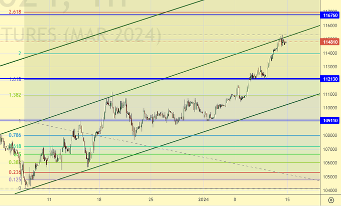 Возможен откат к 112000 после чего рост продолжится к 117000. Если мы сегодня пойдем вверх без отката, то от 117000 можно продать. Отметим, что рынок смотрит на отметку 125000. К марту можем прийти туда.