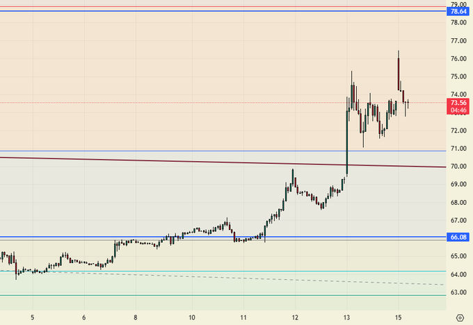 Учитывая произошедшее в пятницу: атака Израиля на Иран и немедленный ответ, можно предположить, что сейчас ценник полностью будет зависеть от того, договорятся стороны или нет. На данный момент не сильно похоже, что кто-то остановится. Однако, к концу недели арсеналы ракет существенно похудеют, что заставит стороны взять паузу, а вот до конца недели скорее всего будет рост.