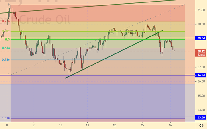 Продажа: нет. Кто вошел от 69.30 и 69.80, перенесите стоп на 69.70. Цель: 63.60.
