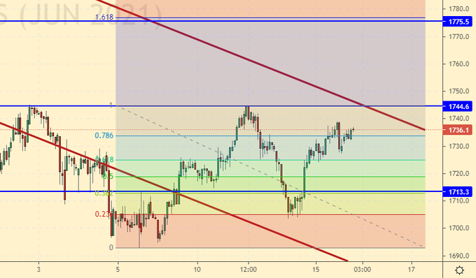 Очевидно, что в районе 1750 будет борьба. В случае роста выше, сможем пройти к 1775. Многое будет зависеть от взгляда ФРС на текущую ситуацию. Если часть трейдеров сделает ставку на то, что роста ставки в ближайшее время не будет, золото может вернуться к росту.