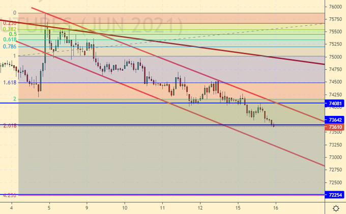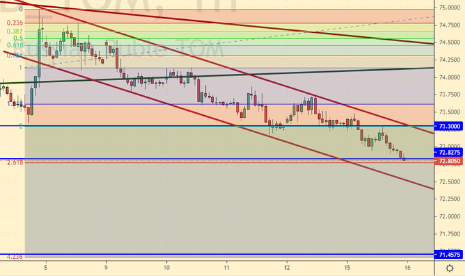 Мы пришли к 72.80. Здесь напрашивается хотя бы небольшой отскок вверх. Если нефть продолжит падать, то его мы и увидим. Отметим, что проблемы в Донбассе могут сказаться на курсе рубля к доллару в случае обострения ситуации. Тактически можно рассмотреть взятие возможного хода от 73.40 до 74.40.