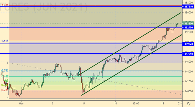 Идем к 157200. Для вошедших в лонг ранее ситуация благоприятна. Смысла открывать новые длинные позиции нет. Посмотрим, сможет ли сегодня корректирующаяся нефть подпортить настроение инвесторам. В районе 157000 есть смысл поискать возможности для входа в шорт.