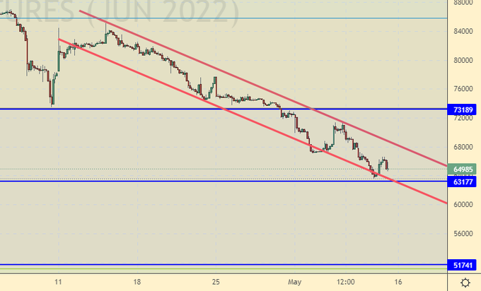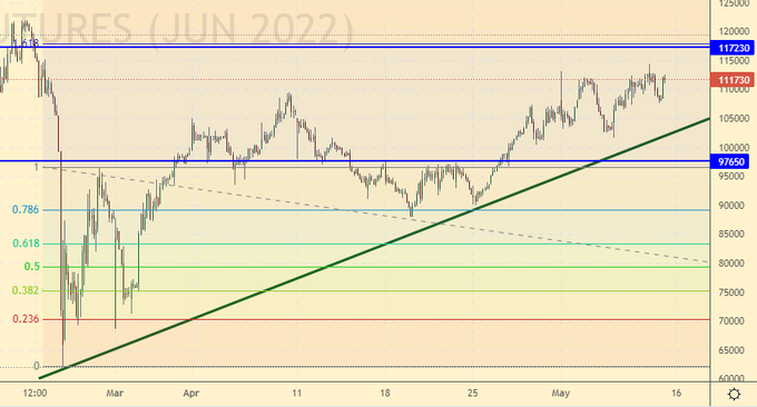 Рынок акций вряд ли будет расти в летние месяцы. Скорее всего индекс будет подниматься только за счет укрепления рубля. Интересные уровни для входа в шорт 118000 и 130000.