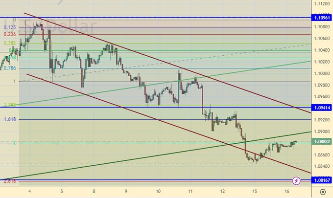 Пока цель на 1.0815 не достигнута у быков по евро есть шансы на разворот и расталкивание рынка вверх в сторону 1.1900. Если же мы увидим касание цели по развивающемуся сейчас импульсу вниз, то это будет означать высокую вероятность подъема в район 1.0950 и продолжения падения.