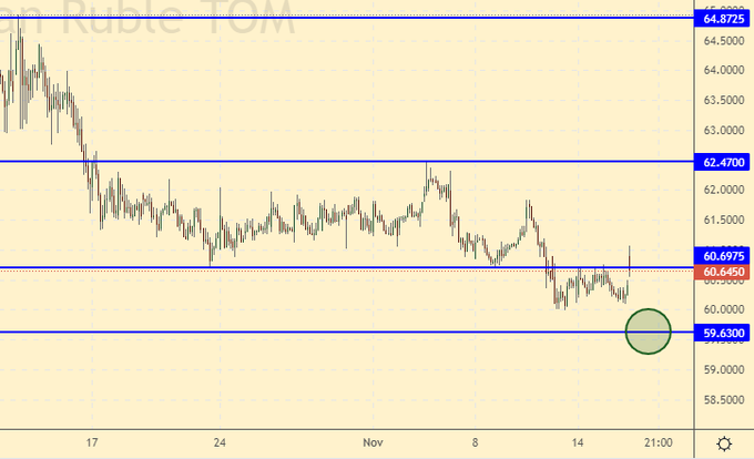 Рубль сегодня может немного понервничать, однако, никаких сильных изменений курса мы не ждем. Пока ЦБ держит ситуацию под контролем. Возможный откат к 59.60 продолжаем рекомендовать для покупок.