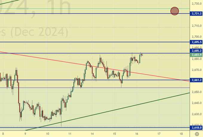 Находятся приверженцы роста золота. Ничего нового: мы идем к 2720. Если он действительно состоится, то мы вынуждены будем говорить и о более высоких отметках: 2838, например. 7 ноября, это не праздник, это заседание ФРС, всё ближе, и вряд ли до него будут попытки пробиться выше 2720. Это было бы слишком агрессивно.