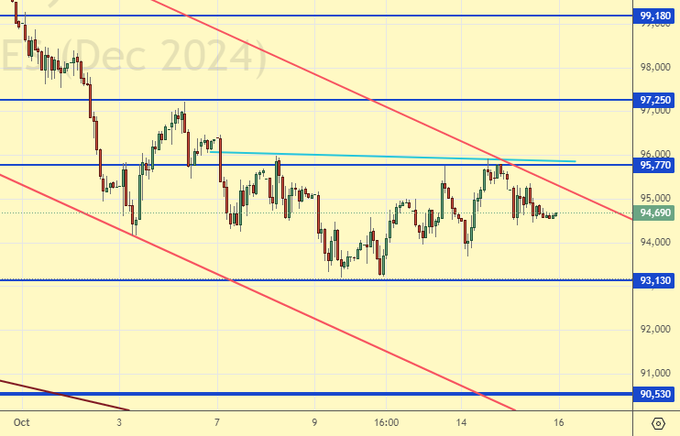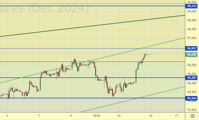 Ждали мы, ждали 92850. И не дождались. В узком канале растем. Хотим 100000. Покупать тут особо негде. Если рынок нарисует откат хотя бы к 95500, то можно войти. Внутри дня можно пытаться на мелких интервалах подстроиться к росту в случае взятия сопротивления на 96600.