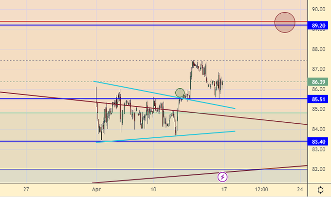 Покупка: нет. Кто в позиции от 85.70, держите стоп на 85.30. Цель: 89.20.