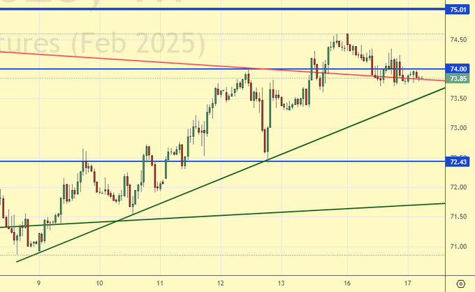 Рынок продолжает оставаться в диапазоне. Отметим неспособность пройти выше 75.00.
